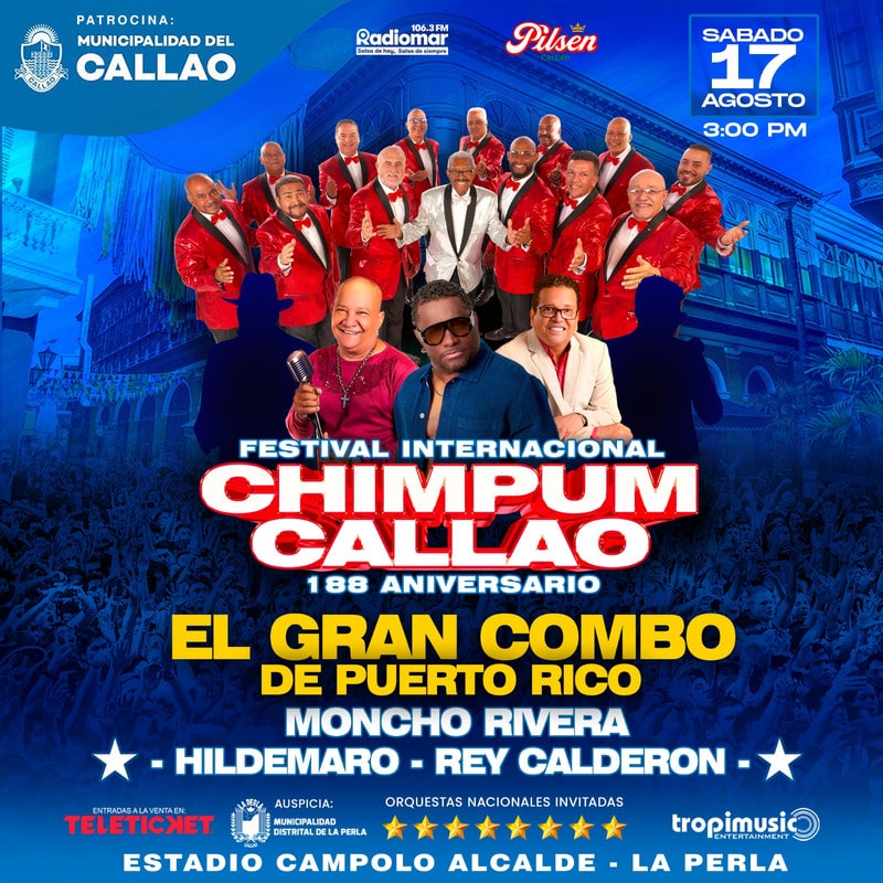 Una constelación de estrellas han sido confirmadas en una nueva edición del festival Chim Pum Callao 2024. Gran Combo de Puerto Rico, Rey Calderón, Moncho Rivera, el nuevo ídolo del puerto chalaco, Hildemaro y dos estrellas “bomba”, regresan al primer puerto chalaco para celebrar como se debe los 188 aniversario de fundación el 17 de agosto en el estadio Campolo Alcalde.